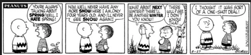 In reality, the leaves are an expression of the life that is contained in the roots and the branches of the tree. Life courses through the leaves, creating an “artistic expression” of something that cannot be seen. They are beautiful, and valuable; but they are only made to last for a season. When a leaf falls to the ground, we do not despair, because God has written the promise of hope and renewal into his creation. We are confident that although there will be a season of barren trees, there will also be a season of renewal. We have seen it, and we no longer need to question it. I remember this peanuts cartoon, where Linus is mourning the fact that the snow is gone, and he will never see it again.